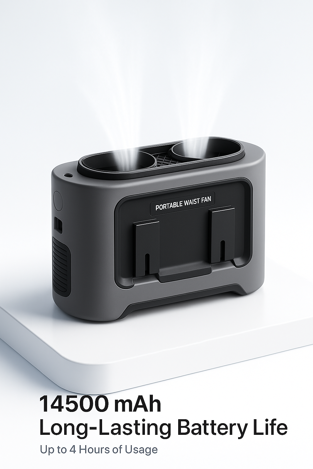 Key Features: 14500mAh battery | 40-hour runtime | Four-speed control with storm mode | Twin turbofan technology | Waist/neck hanging | LED digital display | Power bank function | Flashlight | Sweatproof/dustproof/dropproof